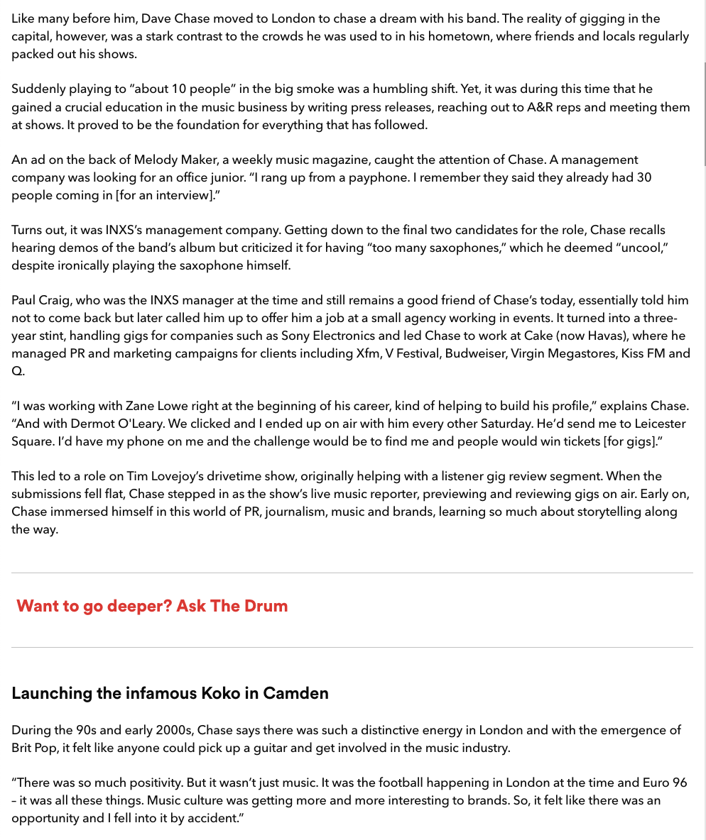 Dave began his career as a musician, but quickly moved behind the scenes working at a variety of agencies with clients including Xfm and Coca Cola, before establishing a youth culture marketing agency with the founders of iconic lifestyle bible, Sleazenation. Dave went on to marketing and leadership roles at MUTE Records and London venues KOKO, Lafayette and Omeara and a joint venture between Universal Music and WPP.