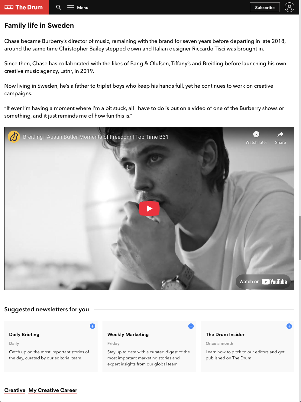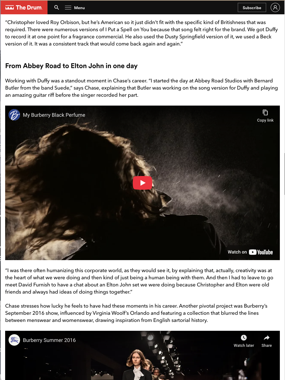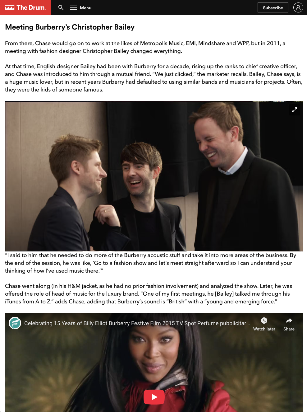 Dave and Christopher collaborated on a soundtrack that became as essential to the Burberry brand as its infamous Trench coat, partnering with emerging and established musicians to deliver bespoke live performances within London Fashion Week shows and creating new music and recordings that featured on global advertising campaigns.